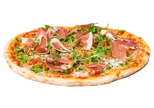 mit luftgetrocknetem, italienischem Landschinken, Parmesan, frischem Rucola und Tomatenwürfeln mit Mozzarella auf fruchtiger Tomatensauce
